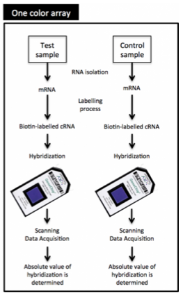 Briefly describe the one colour array method used to produce a gene expression microarray?