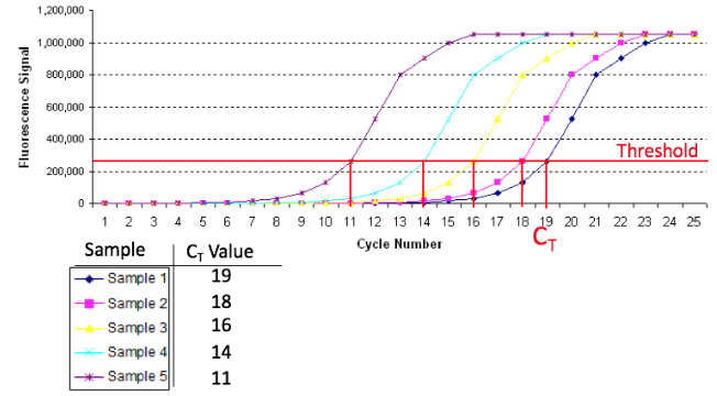 The cycle threshold is defined as the number of cycles required for the fluorescent signal to cross the threshold (background fluorescence).