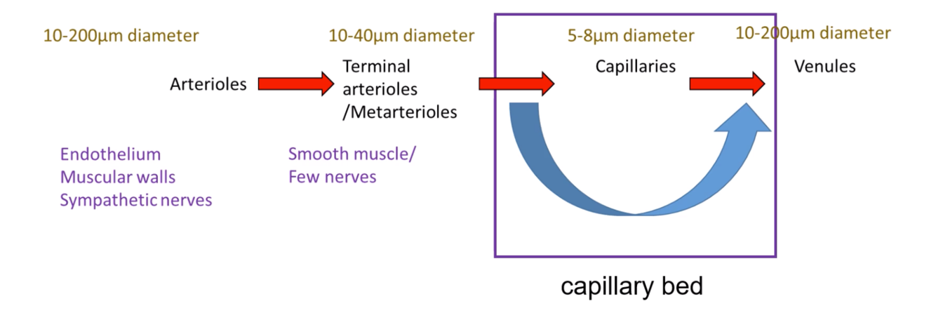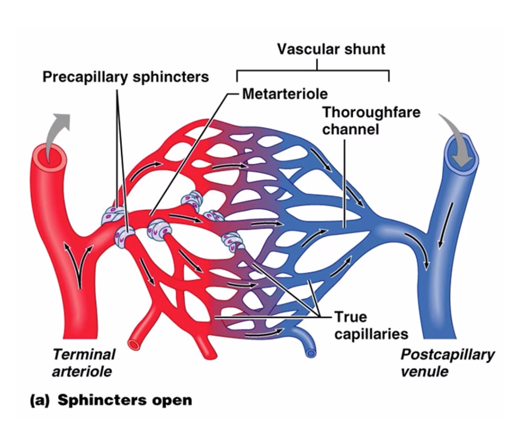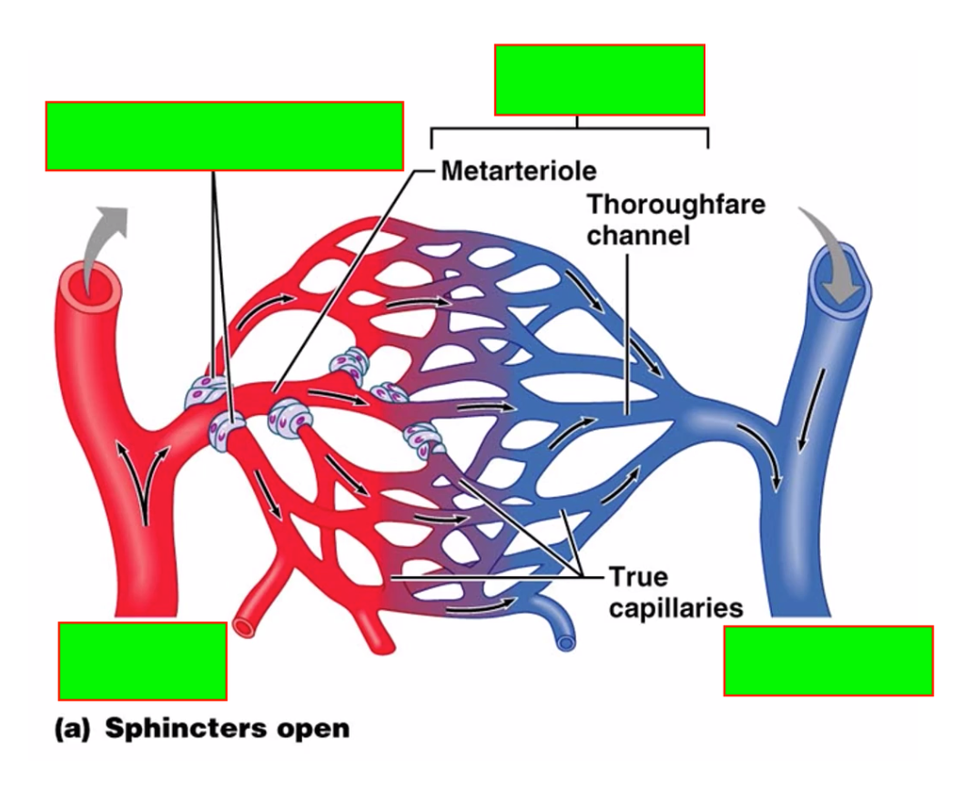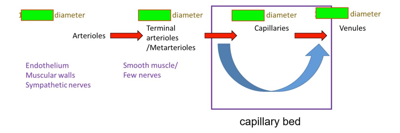 within capillary bed: what is happening at a) arterial end b) venou end?