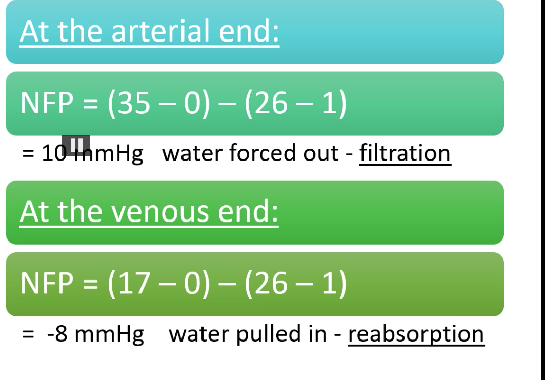 Net filtration pressure at arterial end / venous end? what does it mean occurs here?