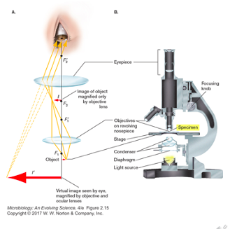 - ocular lens (10x magnification), objective elns (10x-400x mag) *needs to be parfocal)
