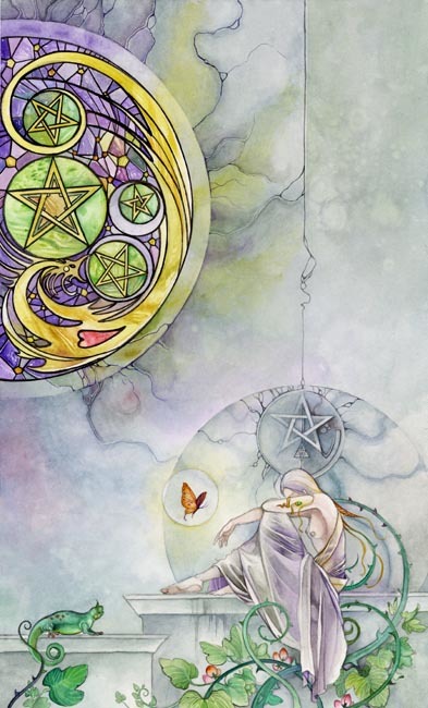 Steadfast, conservative, and stubborn; he is set in his ways and on his path, locked onto his goal, with almost a tunnel-vision mentality. The foliage parts for him in a narrow path, and he has eyes for none of the temptations around him; only for the light that is his goal. The Knight of Pentacles is methodical, thorough, and unwavering. He rides upon the crest of an earth dragon, grounded, slow but undeniable in its progess – where he sets his sights will be reached.