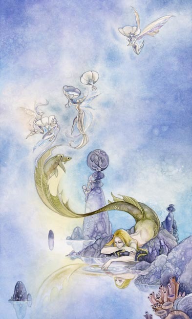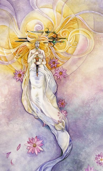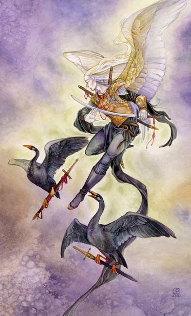 The Knight of Swords is the brave hero who rushes headlong into conflict to defend his beliefs. He is blunt and comes directly to his point. He is domineering, a seeker, slicing through the skies with his sword and his wings. A storm gathers in his wake, borne of the turbulence his winged army creates, and he is lifted high above it all to pierce through the chaos. The sword is a beacon.