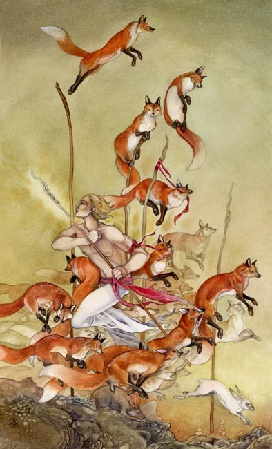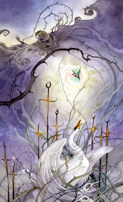 The Brambles Crone lives among the blackberry hedges where the fruit is tempting and sweet, but even the leaves have wickedly curved thorns to catch and hold. The little hummingbird may flit and navigate with ease among such treacherous tangles, but the noble and grand elegance of the Swan with the arcing spread of her wings is not for such tangled and thorny corridors.