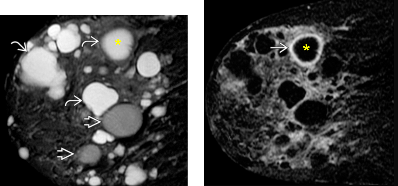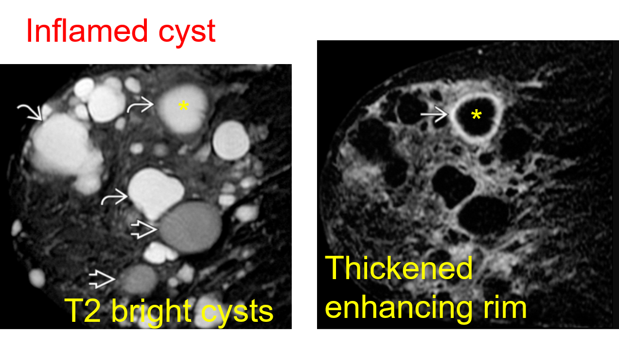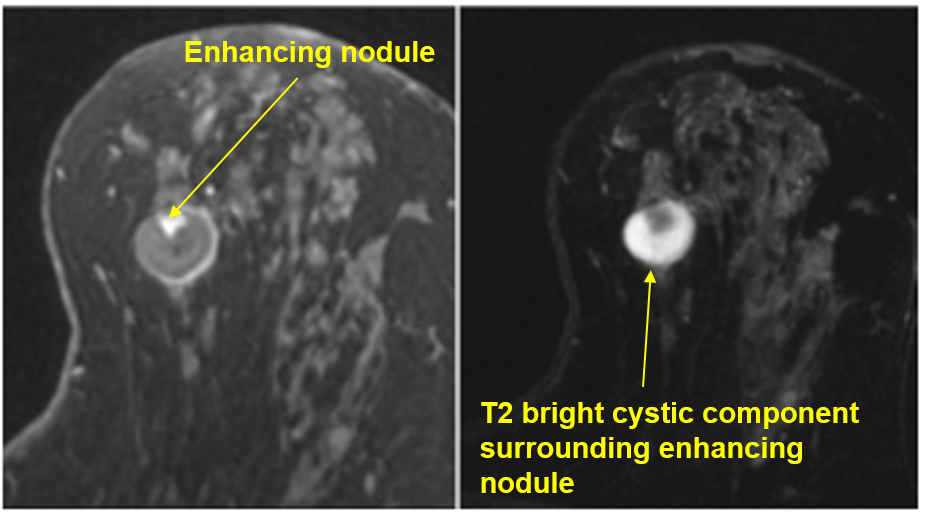 MR: Characteristic high-signal T2/STIR due to high mucin content; avid, slow rim enhancement