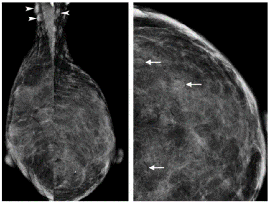 NF-1 in an 80-yearold woman with multiple superficial neurofibromas over her torso. Right and left MLO mammograms (a) and left craniocaudal mammogram (b) show numerous dense, circumscribed ovoid masses surrounded by lucent halos of air in the axillae (arrowheads in a) and breasts (arrows in b), findings that represent cutaneous neurofibromas.