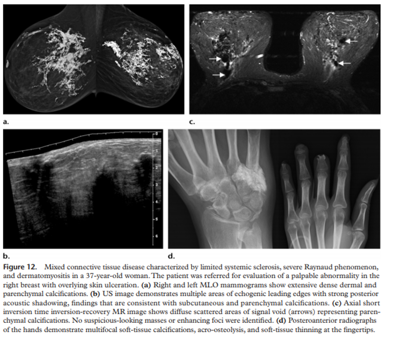 Mixed connective tissue disease characterized by limited systemic sclerosis, severe Raynaud phenomenon, and dermatomyositis in a 37-year-old woman.