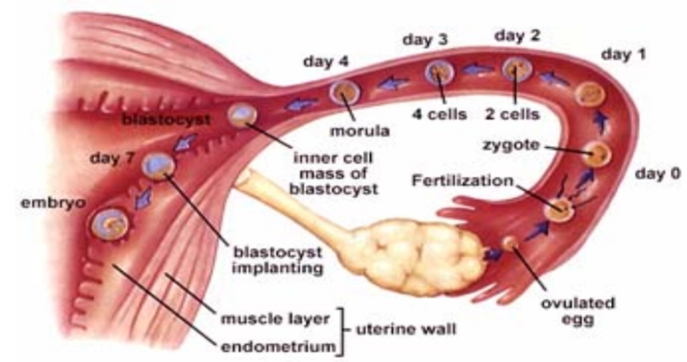 Outer layer of blastocyst forms trophoblast which will form placenta and from day 6-12 invades endometrium to achieve implantation