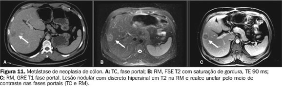 metástases hepáticas mostra diminuição do sinal em comparação com o parênquima hepático normal em imagens ponderadas por T1 e aumento do sinal em imagens ponderadas por T2.