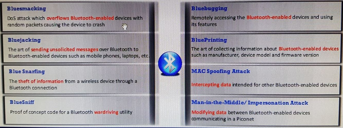 Bluesmacking (DOS de Bejos) -> overflows devices with random packets. Similar to ICMP ping of death.