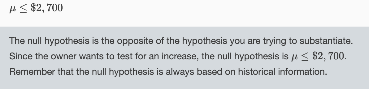 The owner of a local health food store recently started a new ad campaign to attract more business and wants to test whether average daily sales have increased. Historically average daily sales were approximately $2,700. After the ad campaign, the owner took a random sample of forty-five days and found that daily average sales had increased to $2,984.