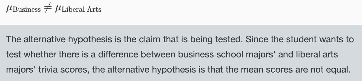 A college student is interested in testing whether business majors or liberal arts majors are better at trivia. The student gives a trivia quiz to a random sample of 30 business majors and finds the sample’s average score is 86. He gives the same quiz to 30 randomly selected liberal arts majors and finds the sample’s average score is 89.