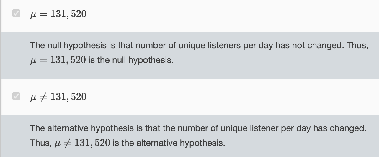 The null hypothesis is that the average number of unique daily listeners per day has not changed, that is, it is still 131,520. Therefore, the p-value of 0.0743 indicates that if the average number of unique daily listeners is still 131,520, the likelihood of obtaining a sample with a mean at least as extreme as 124,247 is 7.43%%.