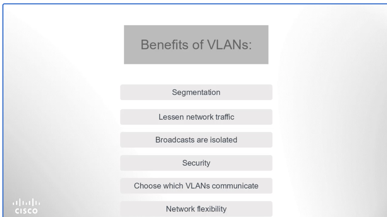 They operate at the OSI Layer 2, they are by default seen as one physical broadcast domain. Any broadcast frame sent is flooded everywhere. L2 Switches can be logicially split into VLANs. VLANs allow for the switch to be logically segmented… this can improve performance, improve security, provide flexibility.