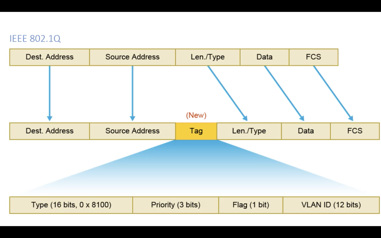 The original frame is expanded and a 4 byte tag field is added into the frame. The 4 byte field includes the following: