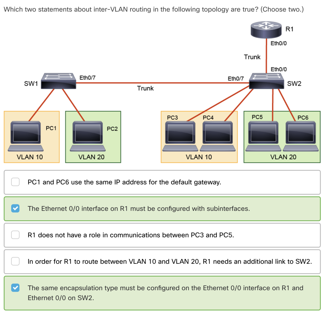 5) The same encapsulation type must be configured on the Ethernet 0/0 interface on R1 and Ethernet 0/0 on SW2.