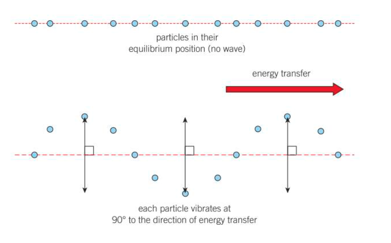 A transverse wave is a wave in which the direction of oscillation of a wave is perepndicular to the direction of motion of the wave