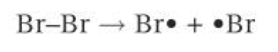 The reaction is started when the covalent bond in the halogen molecule is broken by homolytic fission. Each halogen atom takes 1 electron from the pair, forming 2 highly reactive bromine radicals. The energy for this bond fission is provided by UV radiation