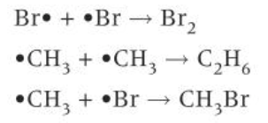 In the termination stage, 2 radicals collide, forming a molecule with all electrons paired. There are a number of possible termination steps with different radicals in the reaction mixture. When 2 radicals collide and react, both radicals are removed from the reaction mixture, stopping the reaction