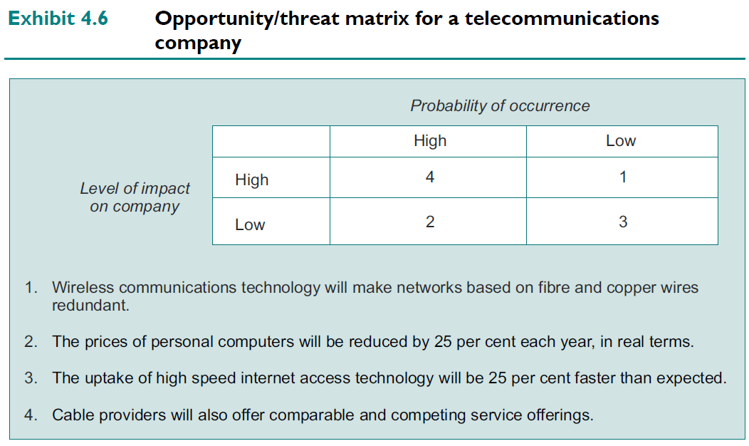 The opportunity/threat matrix enables the examination of a large number of events in such a way that management can focus on the most important ones. Thus, events such as number 4 in the exhibit, with a high probability of occurring and having a high impact should be closely monitored. Those with a low probability of occurrence and low impact, such as number 3 in the exhibit, should probably be dropped, at least for the moment. Events with a low probability/high impact (number 1) should be re-examined less frequently to determine whether the impact rating remains basically sound.