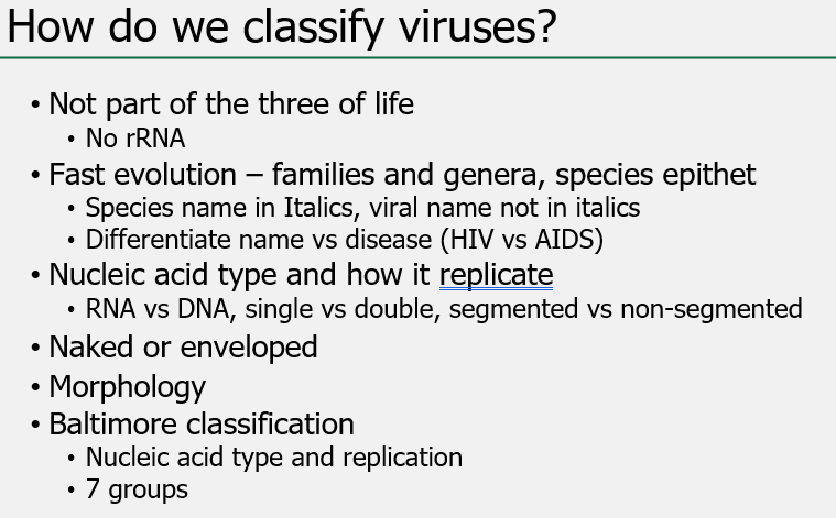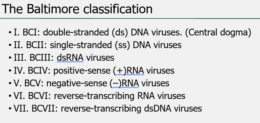 List the 7 baltimore classifications and their nucleid acid type/replication