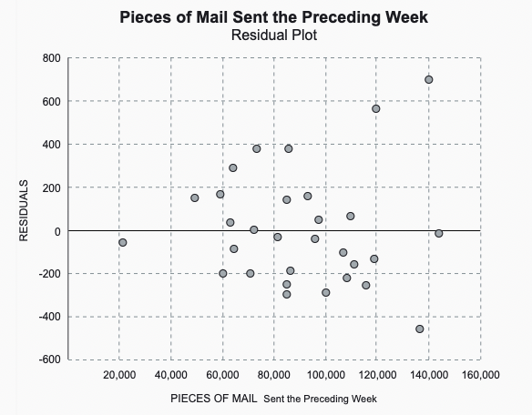 True. There appears to be heteroskedasticity because the residual plot for “Pieces of Mail Sent the Preceding Week” exhibits a funnel shape.