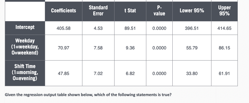 70.97 is the net effect of the day being a weekday on the number of chairs produced per shift. On weekdays the Weekday variable is set to “1” in the regression. On weekends the Weekday variable is set to a “0” in the regression equation, so we essentially exclude this variable. Therefore, we can conclude that on weekdays, the average number of chairs produced is 70.97 greater than on weekends, provided that the shift time remains constant. Equivalently, we can conclude that on weekends, the average number of chairs produced is 70.97 less than on weekdays, provided that the shift time remains constant.