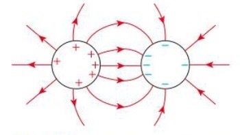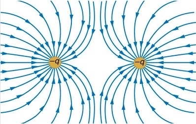 Draw a diagram showing the electric field between a positive and a negative charge