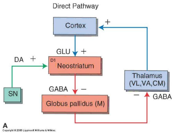 o Diminished activation of excitatory D1 receptors reduces striatal output within the direct basal gangliar pathway
