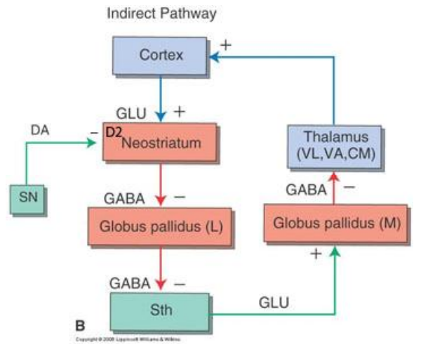 – The net effect is increased inhibition of the thalamus, leading to decreased cortical activity and hypokinesis
