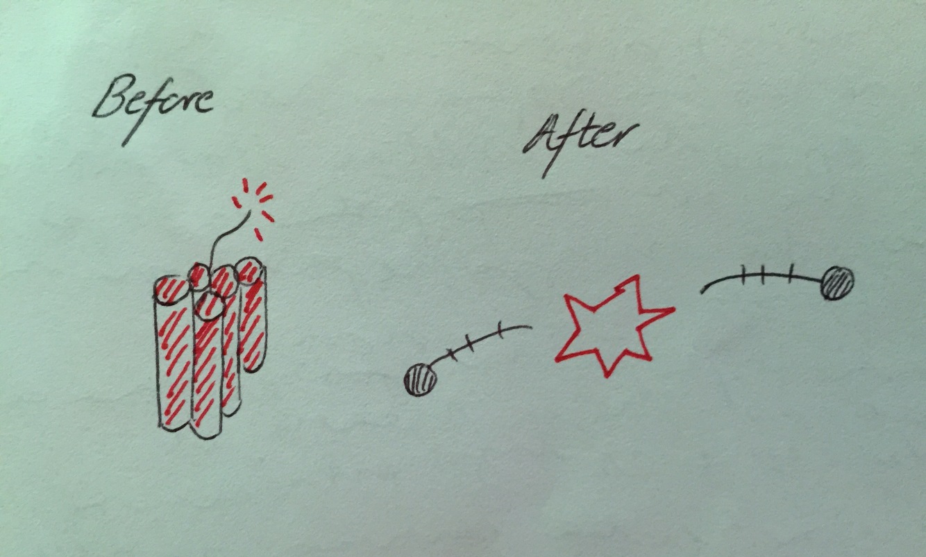 Before, the velocity is zero. Therefore, the momntum of the dynamte is zero as M = m x v. After, the dynamite explodes in the exact opposite direction (positive and negative). The equal positive and negative momentum cancel each other out having a total momentum of zero. This proves the conservation of momentum as the total momentum before must, and does, equal the total momentum after.
