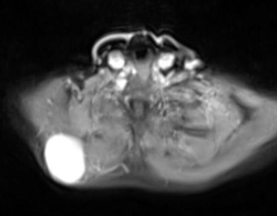 T2: high signal and surrounding low signal rim representing sclerosis may be present