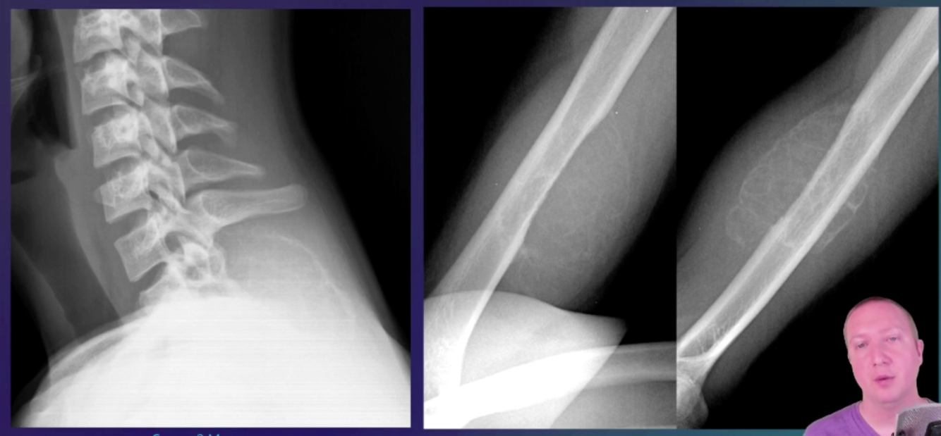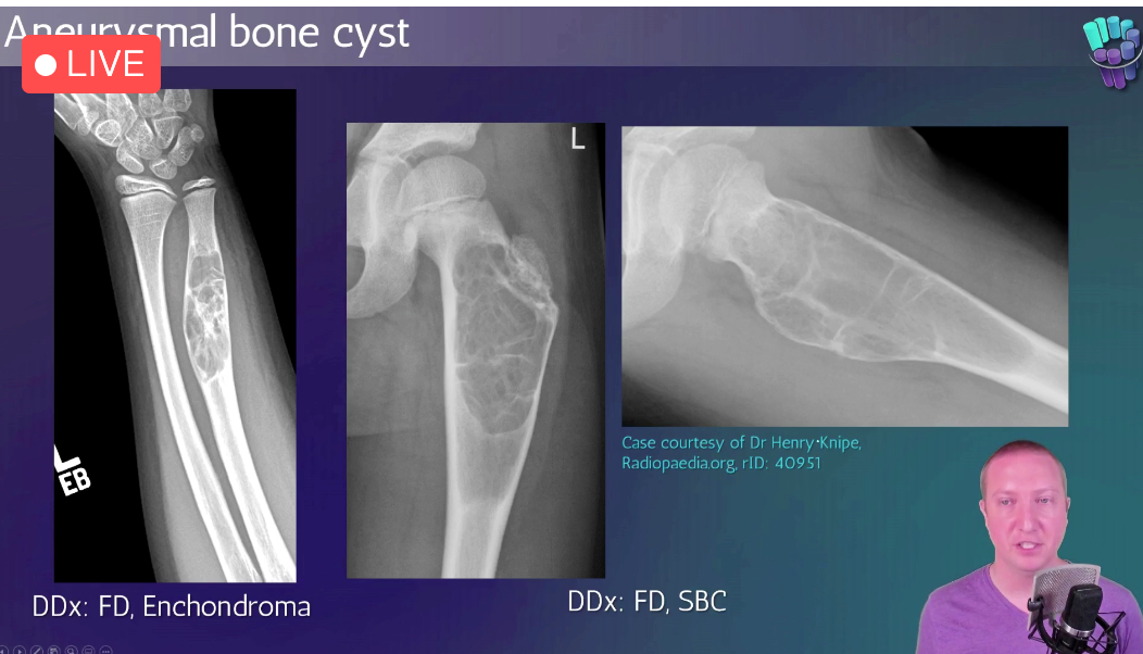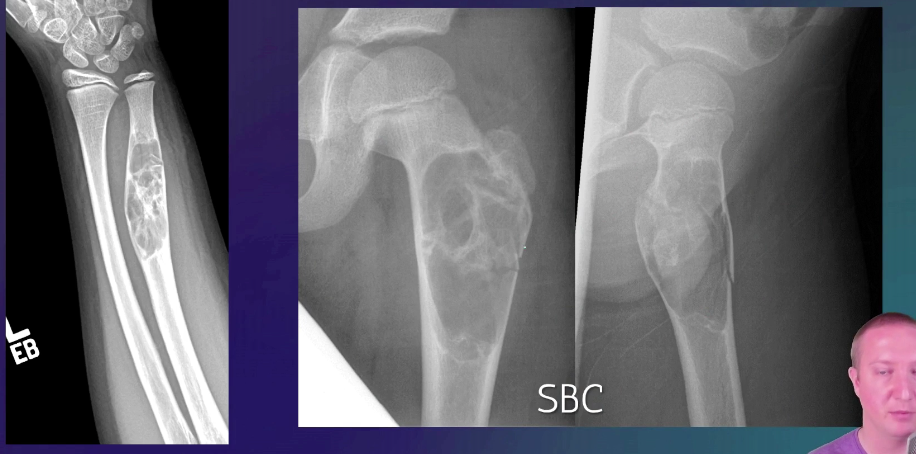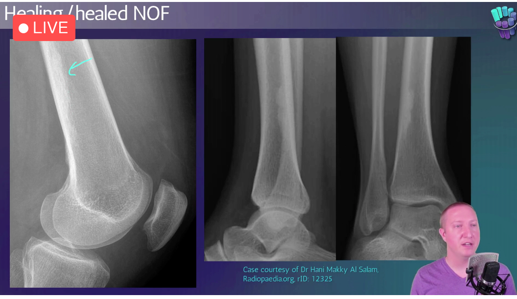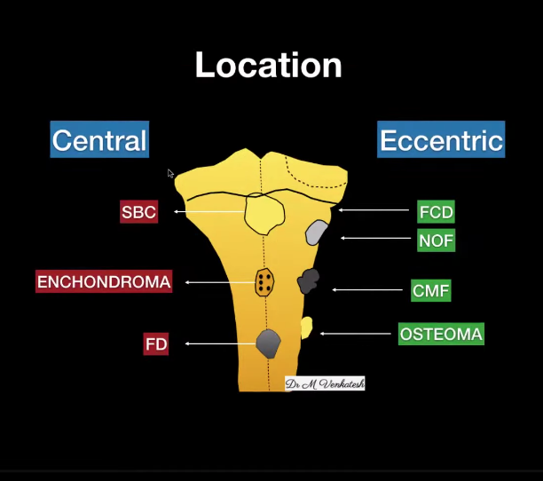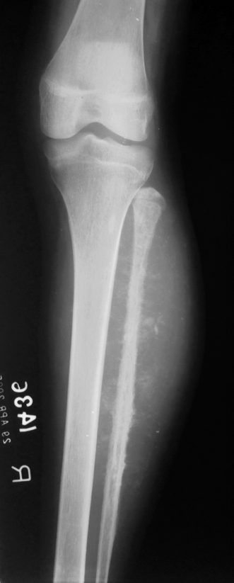 Osteofibrous dysplasia * benign fibro-osseous cortical lesion * occurs almost exclusively in the tibia and fibula. * It is most commonly seen in the mid-diaphysis of the tibia. * Terminology * A commonly used synonym is ossifying fibroma of the long bones. * Epidemiology * most common in younger patients, e.g. ~ 10 years of age * less commonly reported in older patients, up to 63 years of age 3 * slight male predilection (3:2 ratio 3) * Clinical presentation * Most patients present with pain and swelling, and patients may present secondary to a pathological fracture. * Pathology * Osteofibrous dysplasia is considered as a benign, non-neoplastic condition. Some consider it as part of a spectrum of osteofibrous dysplasia-like adamantinoma and adamantinoma. * Microscopic appearance * Histology shows trabecular bone woven within fibrous stroma with osteoblastic rimming and mature lamellar bone. * It is closely related to fibrous dysplasia (fibrous dysplasia is predominantly medullary), but the zonal phenomenon and osteoblastic rimming of bony trabeculae are absent in fibrous dysplasia. * Osteofibrous dysplasia and ossifying fibroma of the jaw have similar histological characteristics, but osteofibrous dysplasia shows cytokeratin-positive cells, whereas ossifying fibroma of the jaw shows psammomatous calcification, which are exclusive features. * Although adamantinoma can contain osteofibrous dysplasia-like components, nests or strands of an epithelioid cell are the differentiating feature between adamantinoma and osteofibrous dysplasia. * Adamantinoma with scarce epithelioid component and mostly composed of osteofibrous dysplasia-like tissue are considered as osteofibrous dysplasia-like adamantinoma. * Radiographic features * Osteofibrous dysplasia is classically a lytic lesion centred in the tibial cortex, often with sclerotic margins. * Because of its similarity to adamantinoma, a much more aggressive pathology, a primary issue is differentiating between the two. * Due to intralesional heterogeneity, needle biopsy may result in diagnostic misclassification, particularly with underestimation of aggressive lesions. Thus, radiologic-pathologic correlation is important with benign or equivocal biopsy results 3. * Osteofibrous dysplasia tends to be: * smaller (mean 6-7 cm versus 10-17 cm for adamantinoma) * with more distinct margins * less likely to involve the medullary cavity * Plain radiograph * Plain radiograph remains the initial and chief investigation. * location: * along long axis: mid-diaphysis, especially anteriorly * along transverse axis: cortical with medullary encroachment * consistency * lucent or ground-glass * lobular-to-bubbly in appearance * margins * narrow zone of transition * sclerosis common * no nidus * no aggressive periosteal reaction * benign-appearing periosteal reaction is non-specific, and can be seen in all lesions along the osteofibrous dysplasia/adamantinoma spectrum 3 * +/- pseudotrabeculation and anterior bowing * MRI * MRI is helpful in evaluation of suspected osteofibrous dysplasia, particularly to evaluate the extent of intramedullary involvement. Complete medullary cavity involvement is more suggestive of adamantinoma. * T1: intermediate signal * T2: intermediate-to-high signal * T1C+: diffuse and intense enhancement. * +/- soft tissue component (non-specific) * can be seen in all lesions along the osteofibrous dysplasia/adamantinoma spectrum 3 * no aggressive cortical destruction * Treatment and prognosis * Surgery is reserved for lesions that are large or demonstrate aggressive behaviour. * They usually have an excellent prognosis and usually, stabilise or spontaneously regress once the child is over 10 years old. * It can be locally destructive and may result in pathological fracture, subsequently pseudarthrosis. * Local recurrences can occur after surgery with some aggressive recurrence, possibly due to components of adamantinoma or possible transformation to adamantinoma. * Differential diagnosis * Consider * ossifying fibroma * adamantinoma * osteofibrous dysplasia-like adamantinoma * intracortical fibrous dysplasia
