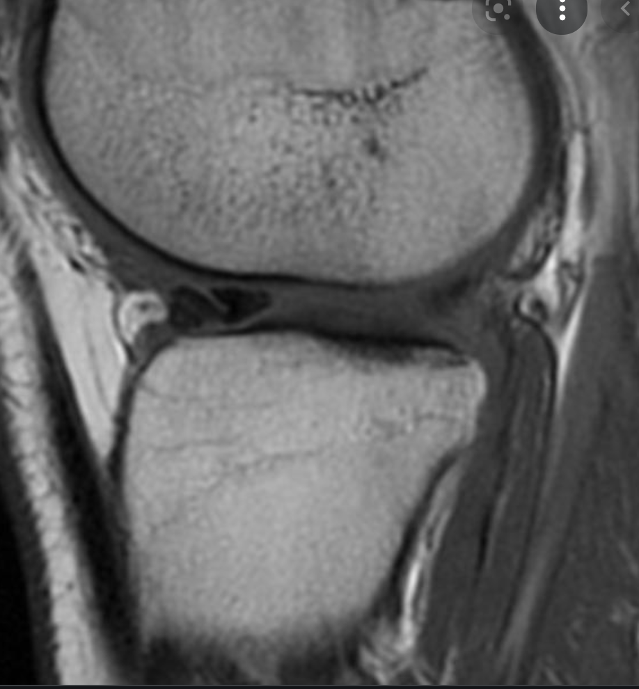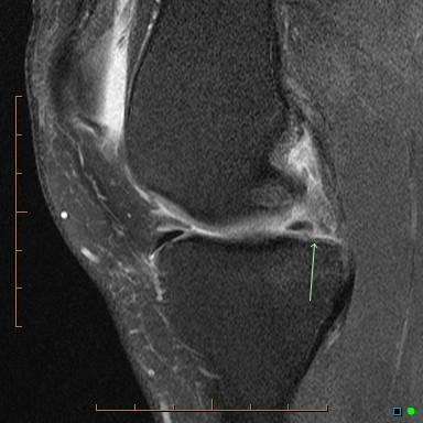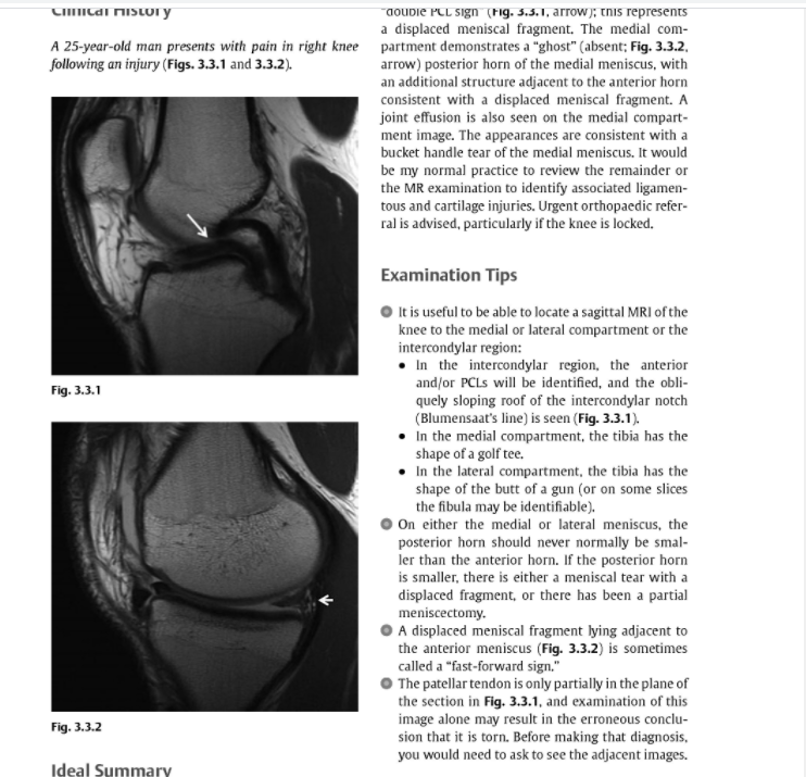 Posteromedial corner injury of the knee * Complication * increased stress on the cruciate ligaments and can result in **anteromedial rotatory instability (AMRI) of the knee.** * **​Clinical** * seen in athletes * sustained with the knee in valgus. * tenderness along the medial joint line. * Pathology * The structures that comprise the posteromedial corner (PMC) are located between the: * posterior margin of the tibial collateral ligament * and medial border of the posterior cruciate ligament * Structures: * **posterior oblique ligament:** * **injury in virtually all cases with associated instability** * **made of three parts** * **superficial arm** * **tibial arm** * **capsular arm** * **oblique popliteal ligament** * **meniscotibial ligament** * **semimembranosus tendon** * **medial meniscus: posterior third** * **​ASSOCIATIONS** * 88% of injuries can be associated with a cruciate ligament injury, overwhelmingly the ACL 1. * Xray * lipohaemarthrosis * fracture of the medial tibial corner * Weight-bearing views can reveal a valgus deformity. .