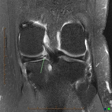 Discoid meniscus Dr Balint Botz ◉ and Assoc Prof Frank Gaillard◉◈ et al. Discoid menisci are those that have a body that is too wide, usually affecting the lateral meniscus. They are incidentally found in 3-5% of knee MRI examinations. Epidemiology Discoid menisci are congenital, frequently bilateral (up to 50%) and have been reported in twins, although no genetic locus has been identified 2. There is a higher prevalence in Asians without any gender predilection 7. Lateral discoid meniscus is far more common than medial discoid meniscus, with the latter being rare. Clinical presentation Although frequently asymptomatic, discoid menisci are prone to cystic degeneration with subsequent tear. Clinical presentation may, therefore, be either incidental or with pain, locking or a 'clunk'. Pathology Discoid menisci have decreased collagen fibres and loss of normal collagen orientation, which predisposes them to intrameniscal mucoid degeneration 7. Classification Classification is based on the degree of peripheral attachments to the tibial plateau, and the shape of the meniscus itself: complete vs incomplete 80% coverage of the tibial plateau is often used as the cut-off between incomplete and complete 7 stable vs unstable stable: normal peripheral attachments with an intact posterior meniscofemoral ligament unstable (also known as a Wrisberg variant): lack or tear of a posterior meniscocapsular (in particular meniscopopliteal) ligaments with an attachment only from the meniscofemoral ligament of Wrisberg 4 anterior or posterior mega horn Radiographic features Plain radiograph Radiographs may well suggest the diagnosis with the widening of the lateral joint space and cupping of the lateral tibial plateau, which is normally flat or even slightly convex. Additionally, there may be associated hypoplasia of the lateral tibial spine. MRI On coronal imaging, meniscal body width of 15 mm or more is typically considered diagnostic of discoid morphology. Alternatively, a ratio of the minimal meniscal width to the maximal tibial width of more than 20% may be used 7,8. On sagittal imaging, the body of the lateral meniscus is normally only seen on two adjacent slices. A discoid meniscus is usually present if the meniscal body is seen on three or more standard sagittal slices - the opposite of the absent bow tie sign. Treatment and prognosis Ideally, the meniscus is preserved with conservative management. If this is unsuccessful, then partial or total resection may be carried out. Complications meniscal tears intrasubstance mucinous degeneration early bony degenerative change