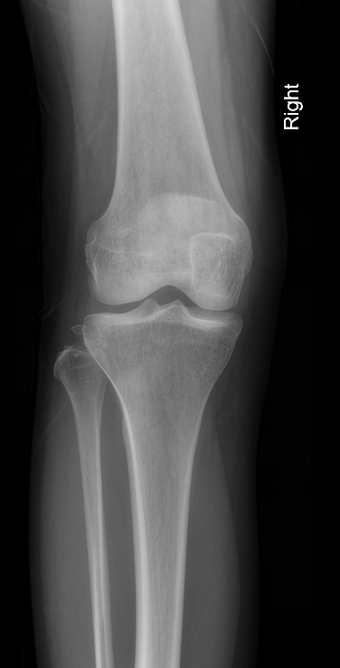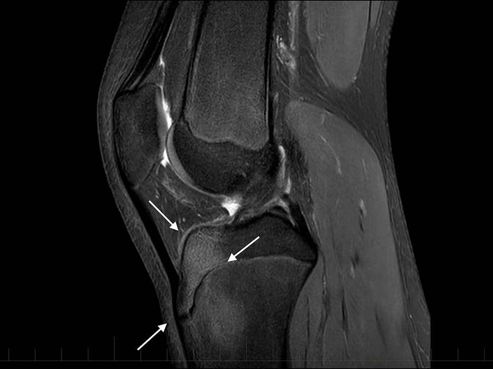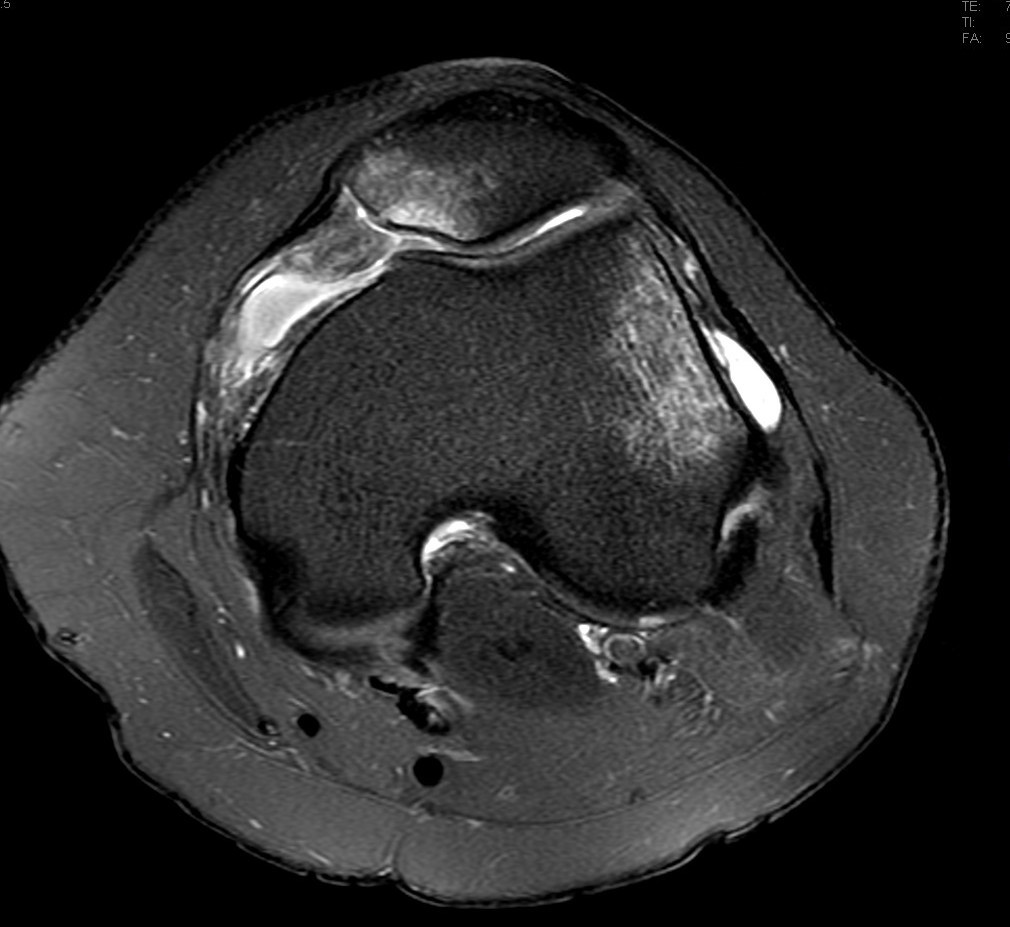* **_Bone bruise_** * marrow contusion of the lateral femoral and tibial condyles and moderate joint effusion. * AKA * bone contusion * trabecular microfracture * Definition * are an osseous injury that results from compression of bone structures. * Pathology * Bone bruises represent trabecular microfractures with haemorrhage and without a discrete fracture line or contour abnormality * They typically appear within 48 hours of injury * can persist for up to six months * Aetiology * Most bone contusions are a result of a direct blow to the bone, traction from avulsion trauma, or load to a subchondral surface * Depending on where bone contusion is seen, the underlying trauma mechanism can be identified. * Complications * They can **progress** to **osteochondritis dissecans.** * Radiographic features * Plain radiography will not demonstrate cancellous features but can show regions of impaction, for example, a Hill-Sachs lesion. * MRI * MRI is the modality of choice when investigating bone marrow. * Bone (marrow) contusion is typically focal and ill-defined with the following signal characteristics 4: * T1: focal hypointense area of bone marrow * T2 fat-saturated: focal hyperintense area of bone marrow