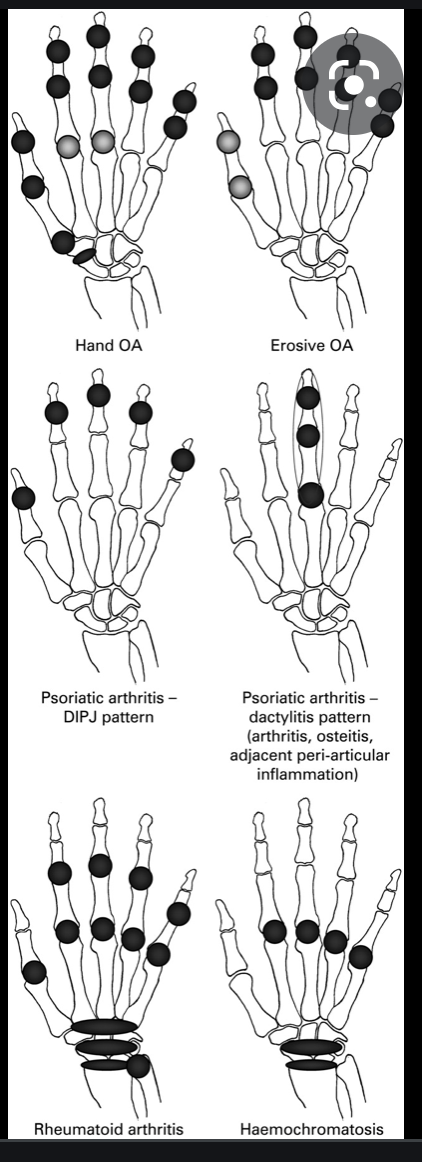 * Sclerosis, joint spaces narrowing * Osteophytes * Subchondral cysts/geodes * Asymmetric JSN due to chondromalacia * Subcondral nbone sclerosis * Subchondral cysts (geods) * Marginal osteophytes * Hand and wrist * DIP - herbedens * PIP - bouchards * Thumb - zig zag BOT *