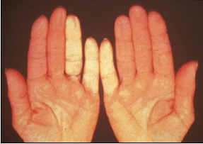Raynaud’s phenomenon - intermittent vasospasm of digits - usually triggered by cold exposure