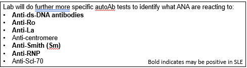 Negative ANA rules out SLE, positive doesn’t diagnose however - may be seen in other autoimmune diseases, infections or even sometimes healthy people
