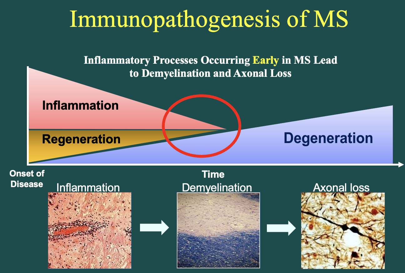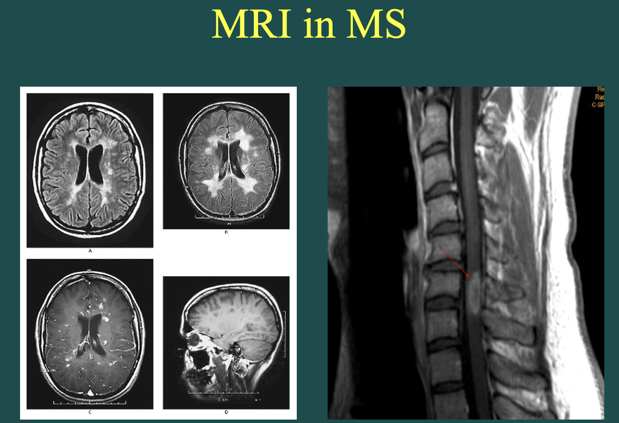 (axonal demyelination → death of axon; they ball up and cause plaques)