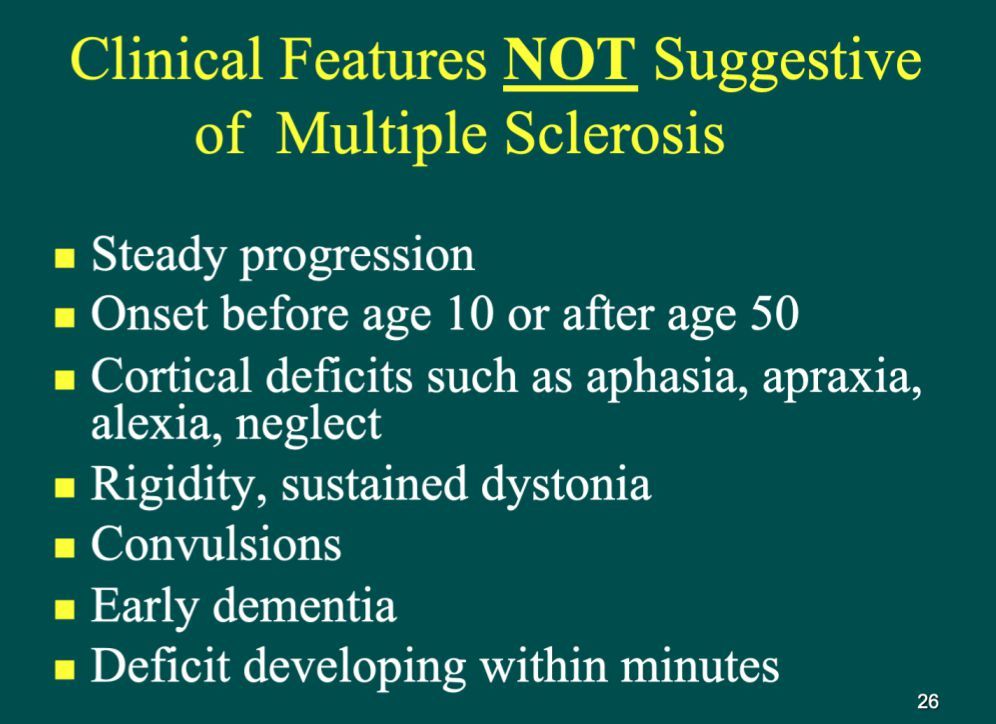 What are some clinical features that are noted not to be suggestive features of MS?