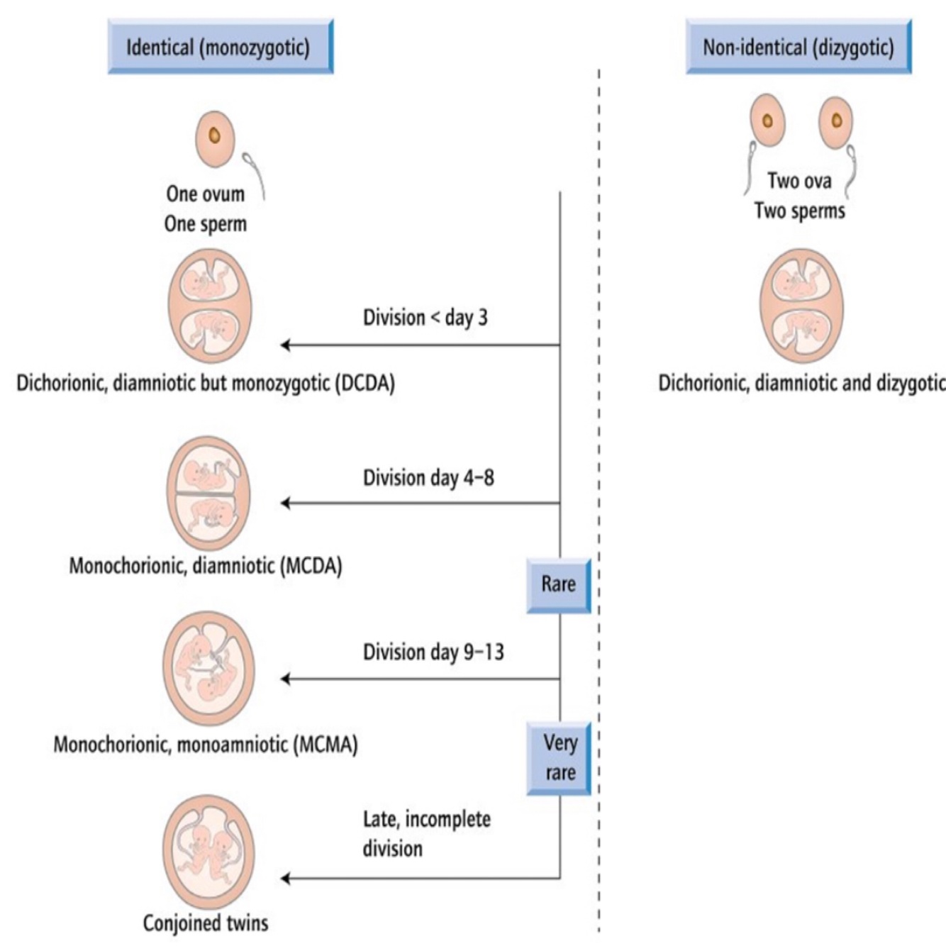 •In monzygotic twins when the zygote splits between day 4-8 the pregnancy will be dichorionic, monoamniotic