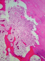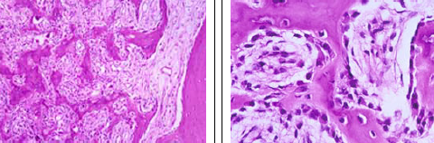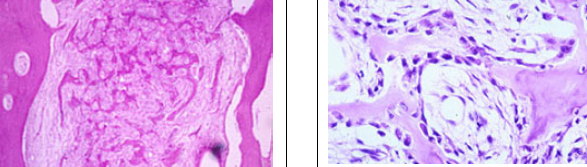 resembles osteoid osteoma; osteoblasts and osteoclast-like giant cells rim interconnected spicules of osteoid and woven bone; intervening stroma shows prominent vascularity; no significant atypia