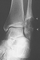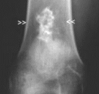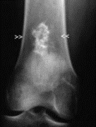 Giant cell tumor relatively uncommon, locally aggressive neoplasm that may produce bone destruction and soft tissue destruction 20-50 years 65% in distal femur, proximal tibia, and distal radius well-defined, lytic lesion eccentrically located in epiphysis with subchondral and metaphyseal extension