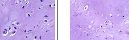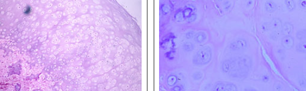 abundant cartilaginous matrix, can be focally calcified; low cellularity; clustered and scattered chondrocytes with small, uniform, darkly staining nuclei; occasional binucleated chondrocytes