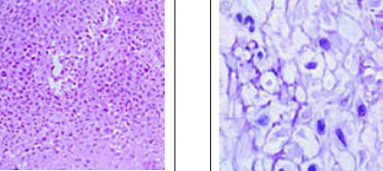 highly cellular, sheets of round to polygonal cells; multiple small foci of immature bluish-pink chondroid give a lobular appearance; multinucleated giant cells; chicken-wire (right photo) calcification