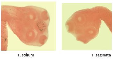 Tell the difference between T. solium and T. saginata.