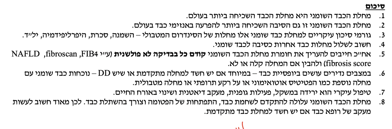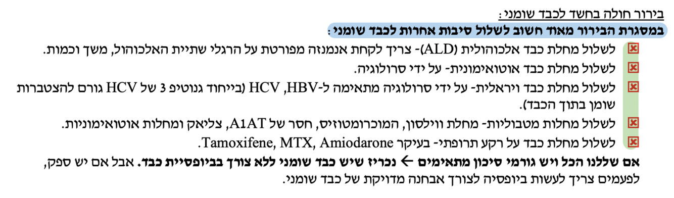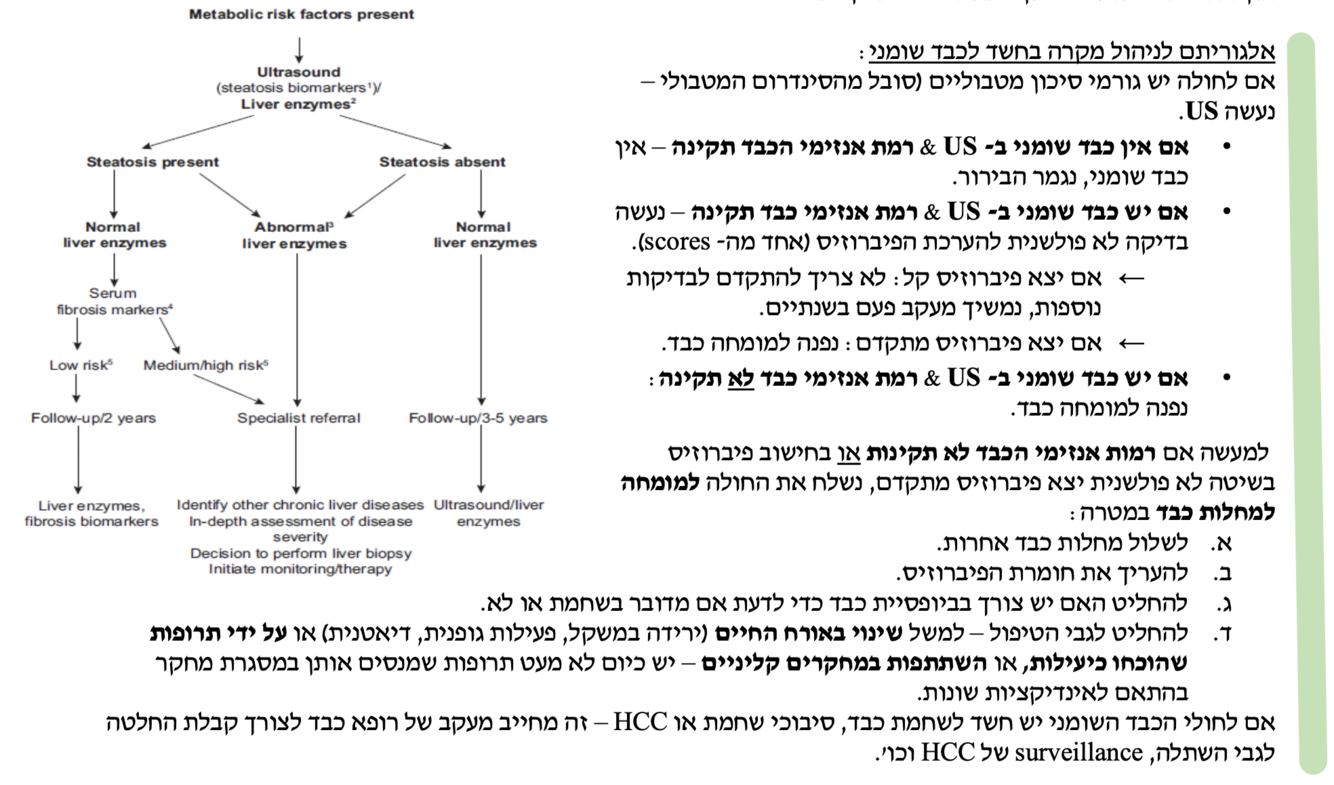 חולשה כללית ועייפות (הכי חשוב ושכיח), הפטומגליה, הפרעה באנזימי כבד, גורמי סיכון של תסמונת מטבולית, באולטרסאונד רואים כבד בהיר (אקוגני)