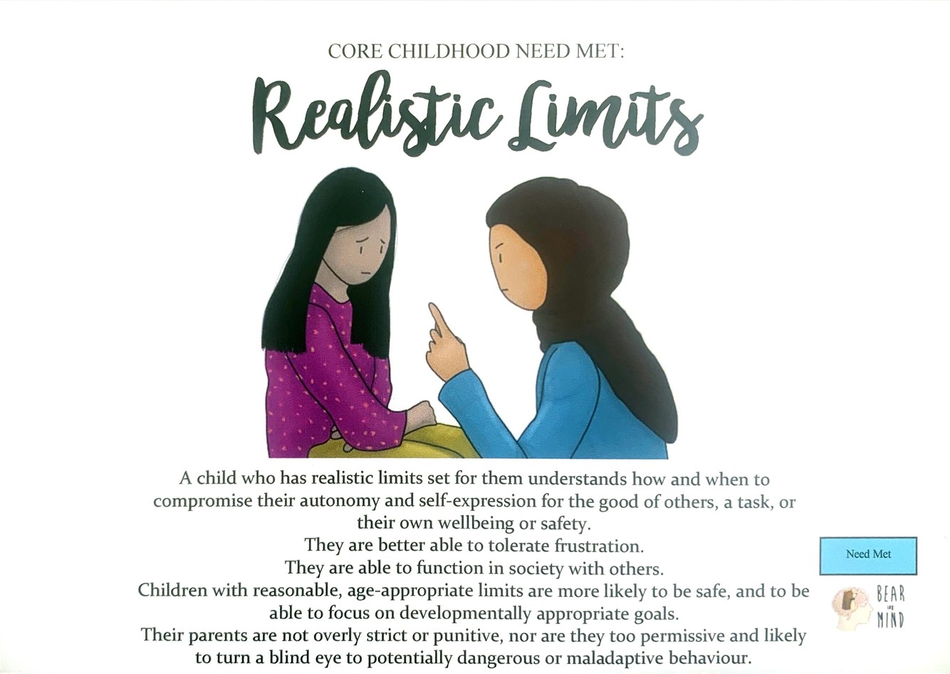 A child who has had realistic limits set for them understands how and when to compromise their autonomy and self-expression for the good others, a task, or their own wellbeing and safety