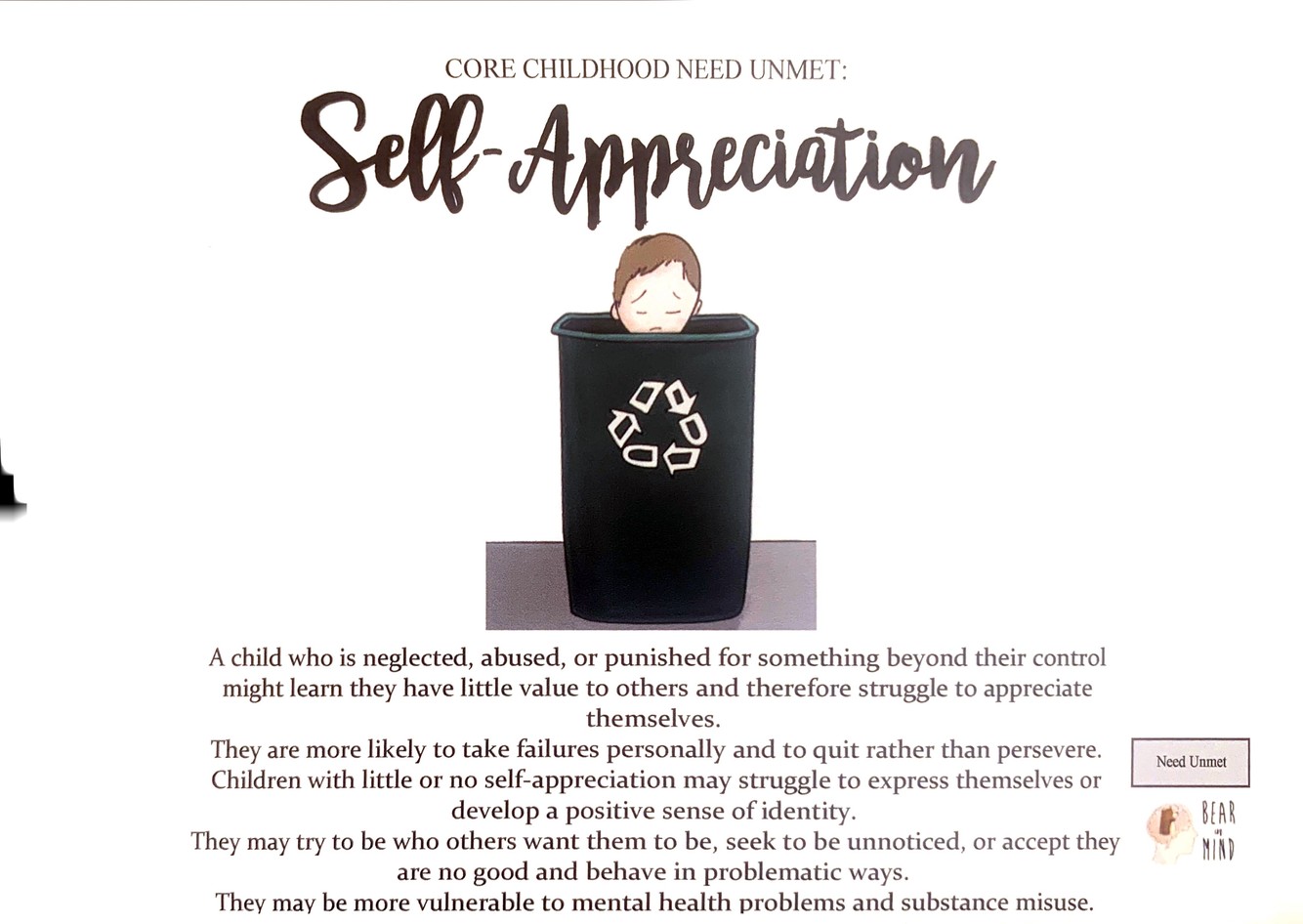 A child who is neglected, abused, or punished for something beyond their control might learn that they have little value to others and therefore struggle to appreciate themselves